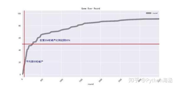 如下图所示:玩家平均在55轮宣告破产,在第256轮,有一半玩家破产,曲线随着轮数的增加趋于平缓,但无限向100%逼近。