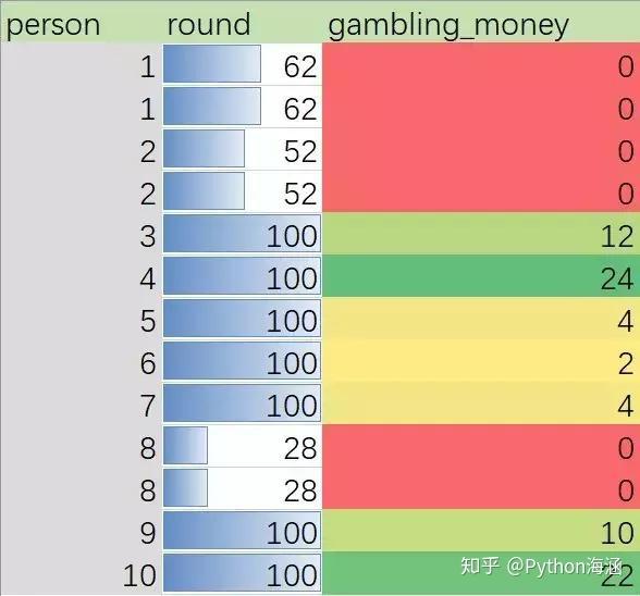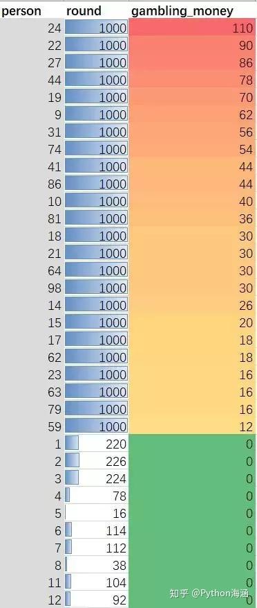 结果显示,赢得最多的玩家赢了24元,而有6位玩家宣告破产(红条),其中运气最差的只玩了28轮。